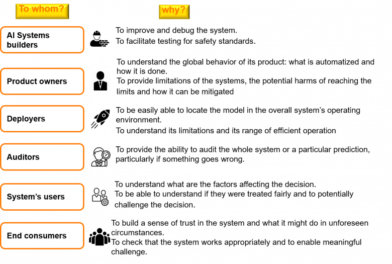 To help choose the most appropriate method, our duo must consider the usage context of the artificial intelligence-based system. Several factors can help the data scientist to identify the most appropriate way to provide an explanation: the recipient, the impact of the system, the regulatory environment and the operational factors. Depending on the recipient’s profile, the explanations to be provided will be very different, as shown in the table below.