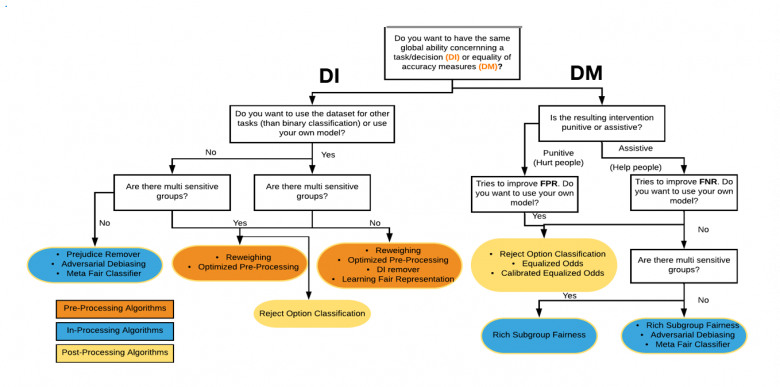 Choosing the appropriate algorithm to meet group fairness requirements (inspired by the tree suggested by the company Aequitas [6])