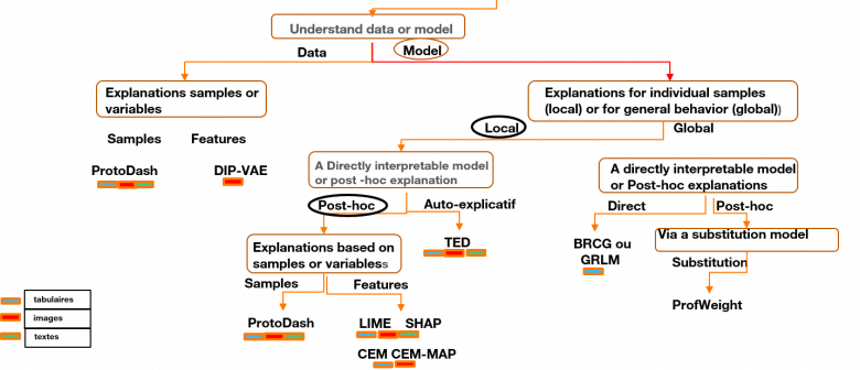 Based on the product manager’s expectations in terms of explainability, it is up to the data scientist to define the algorithm that provides the expected explanation. This can be done using a decision tree, as shown below, which shows the different solutions available. This method consists of navigating from top to bottom of this tree until the appropriate algorithm is identified based on the objectives.