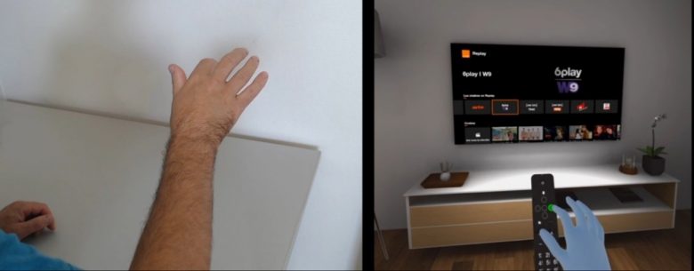 Orange, like various stakeholders in the field of consumer testing [1], has an interest in virtual reality as a context simulation tool to assess the user experience [2], combining both internal validity (reliability and reproducibility of results) and ecological validity (ability to extend results beyond the laboratory). Through its ability to simulate environments close to reality, the great freedom it offers in terms of creation and customization, and its compact and mobile nature, this technology could be an attractive alternative for best assessing the user experience, by immersing testers in real-life user conditions. Indeed, the context in which a service is used impacts the resulting user experience [3], but its various components (physical, temporal, social, etc. [4]) are difficult to incorporate into a laboratory protocol. In situ tests, that is, tests carried out in the actual context in which the product or service is used, make it possible to obtain results that are more representative of the actual uses and associated feelings. However, this comes at the detriment of internal validity, and such tests are also costly and more difficult to implement. It is claimed that the limitations of the laboratory and in situ approaches explain the difficulty in predicting whether or not a product will be a success [5]. An initial study [6], in which assessments carried out in the laboratory, in virtual reality and in the participants’ homes were compared, showed that virtual reality did not introduce major bias. However, no physical interaction was required in this virtual environment: Participants tested the Djingo assistant’s functions by means of voice interaction. A large part of the services subject to consumer testing involve interaction via a manually activated graphical interface, either directly (touch screen) or indirectly using a device (mouse or remote control), or the handling of objects (Livebox, cables or instructions, for example). Performing these tests in a virtual environment raises the following question: Should we simulate the handling in a fully virtual manner (representation of objects in the environment and hand tracking, for example) or should we propose technical solutions that maintain the tactile aspect of the user experience for the most natural interaction possible? It was with the aim of answering these research questions that an initial study was carried out, focusing on the example of the remote control, an item that is needed to allow interaction with Orange’s TV service.