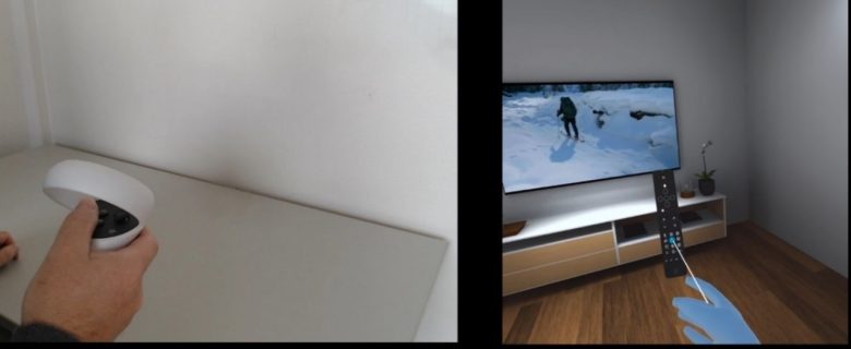 The second solution (Capture 2) is similar to the first but users interact with the virtual remote control by holding a controller in their hand. The user interacts with a virtual “pointer/laser” that originates from the controller and enables the user to select the buttons with which they wish to interact. The visual and audio feedback of the previous solution is complemented by haptic feedback (vibration).
