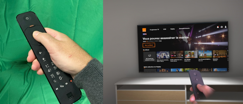 The third solution allows the user to hold a real remote control in their hand (Capture 3). A webcam attached to the virtual reality headset allows the webcam video stream to be overlaid in the VR view. Use of a green background makes it possible to isolate the video stream, so as to retain only the hand and the remote control. This solution offers the advantage of having the same haptic feel as in a normal interaction with Orange TV.