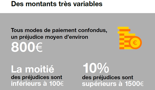 Around 75% of fraud victims suffered a financial loss as a result — €762 on average (standard deviation: 2606; median: 80; maximum: 45,000). Some 55% of these fraudulent transactions were for an amount below €100. But the losses declared were sometimes as high as €45,000.