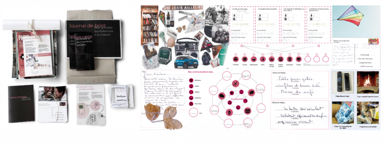 The first study, which lasted two weeks, focused on understanding the activities and lives of the new retirees in their homes. The aim was to gain insight into the relationship that members of the household have with their homes and everyday objects, the activities carried out in the household alone or as a couple, and the interactions that members of the household have with each other and with the outside world. To obtain this information, a data collection protocol was established using various tools. An initial interview was conducted at the beginning of the study to learn about the participants from the point of view of their retirement, and how they were spending it at home. This meeting was an opportunity to introduce the participants to the tools that would be used during the two-week study. In order to more accurately identify the activities carried out within the home and the two spouses’ communications, the participants had to complete a daily logbook to individually and systematically collect information on the activities carried out during the day. To obtain more subjective data and to empathise more directly with participants by collecting fragments of thoughts, emotions and dreams, tools that are more fun and creative were created in the form of cultural probes [15]. As a result, participants were able to write postcards, take photos and record sounds, but also to make photo montages, write poems or add stickers, all in relation to their lives and their homes. This tangible format for collecting information by engaging the participants in manual writing and creative activities made it possible to collect more sensitive and expressive data.