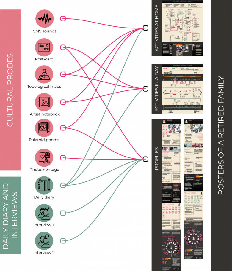 For example, a tool called “empathic windows” was devised to graphically combine and model the data of a household using the set of data gathered during the first field study. Each household is described in four posters: two to describe the couple, one to describe the activities carried out in a day, and the last to understand the household’s atmosphere and which activities were carried out in each room of the home. This tool proved to be very powerful in empathising with the lives of the couples who took part in the study. It helped the researchers to understand, among other things, the importance of balancing shared time with individual activities, to emphasise that the presence of the other sometimes does not prevent a feeling of loneliness and to note the importance of maintaining a network of relationships (family, friends, former colleagues).