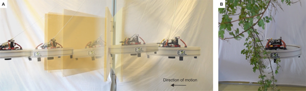 Figure A: an aerial robot successfully traverses the obstacle of a hinged plate whose dynamic parameters are unknown. It continues to follow its reference path while pushing and sliding against the surface. Figure B shows the same experiment conducted with vegetation instead of the plate.