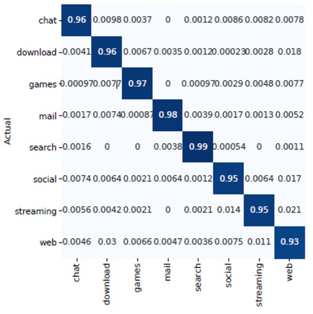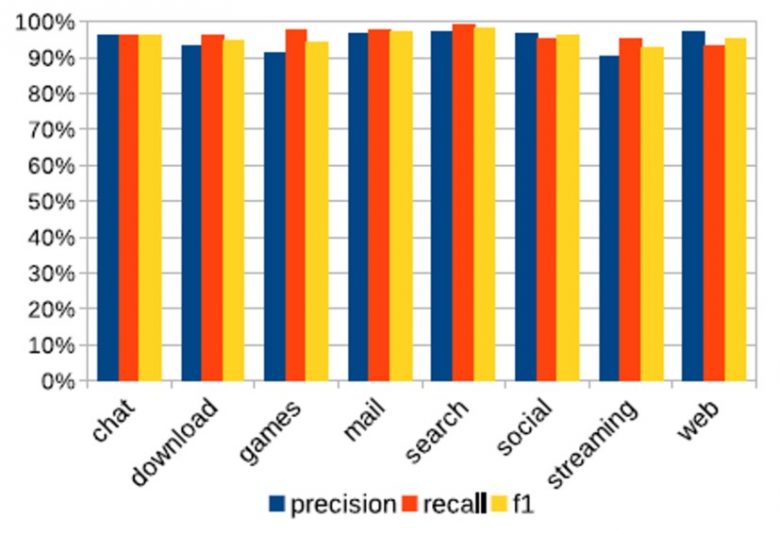 The Orange-Waterloo solution offers superior performance over other state-of-the-art solutions, such as C4.5 [7], a decision tree-based solution widely used for classification, which only ensures a success rate of 81% or than the CNN UCDavis [8] solution, a neural network solution, which has a detection rate of 91%. CNN UCDavis presents a detection quite close to Orange-Waterloo, however, it exhibits many false positives (misclassification) as Orange-Waterloo reduces this false-positive rate by 50% compared to CNN UCDavis. With the Orange-Waterloo solution, the precision (proportion of correct predictions among all predictions made) and recall (proportion of positive predictions for samples that are really positive) values are between 90% and 100% depending on the categories. The f1-score rate, a combination of precision and recall values, has an overall average of around 94%, demonstrating the good quality of the model (see Figure 5).