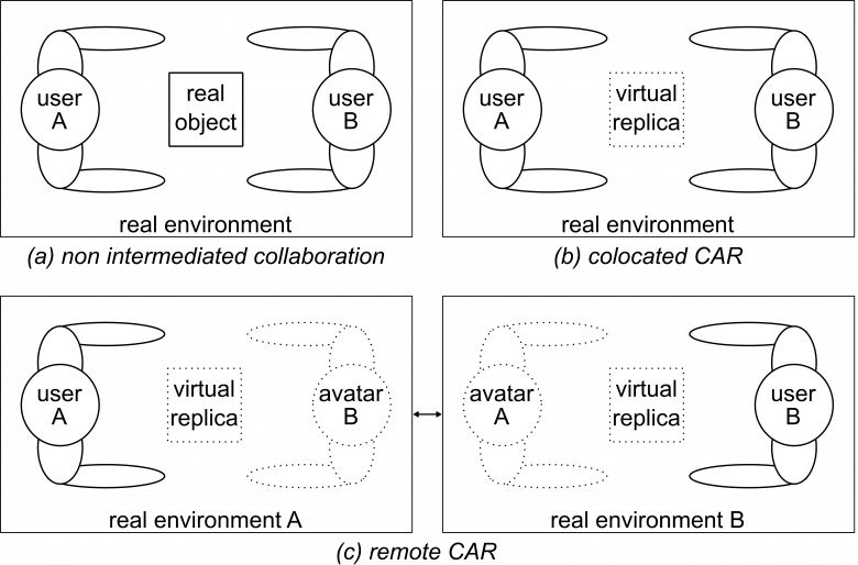 Collaborative augmented reality allows several users to collaborate on tasks involving digital twins, virtual replicas of real objects, augmented real objects, or virtual entities and metaphors (for example, by collaborating on the ubiquitous control of the virtual twin of a real factory synchronized in real time with the factory). Its users simultaneously perceive an environment that combines the real and the virtual, made up of their real environment and a shared virtual space, more commonly known as a metaverse. Employees can be in the same place with co-located augmented reality. Remote collaborators communicate in the form of realistic avatars that look like them, in addition to the voice transmitted by their augmented reality headsets. Figure 1 shows these three methods.