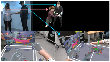 Figure 1 — Top left: Two users collaborate face-to-face on a task involving a real object. Top right: Two users collaborate on a task involving the virtual replica of a real object. Bottom: Two remote users collaborate on a task involving a virtual replica of a real object. They are portrayed through realistic avatars.
