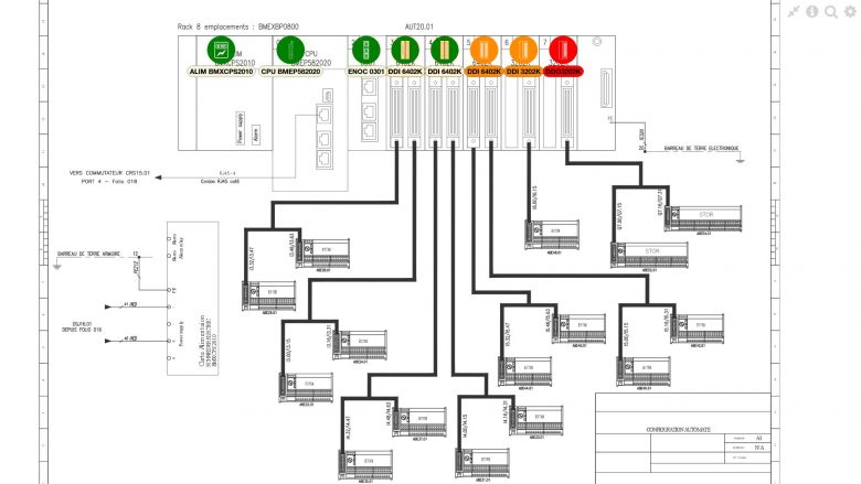 When the first phase of the assembly process is completed, some digital twins represented in the right part of the figure above are already plugged on a rack called “BMEXBP0800”, highlighted on Figure1. The status of the digital twins associated to the communication module called “ENOC”, the power supply “ALIM” and the processor module “CPU” in green color, are “installed”. The red node linked to rack means that this part of the rack is not available in the assembly zone. Thanks to the indoor geolocation system, it has been detected in box1 in the components storage zone. The relations between the highlighted rack and those different parts indicate that all of them must be on the rack but some of them in orange or red colors are not yet inserted and not located in the same area (or zone) of the production plant.