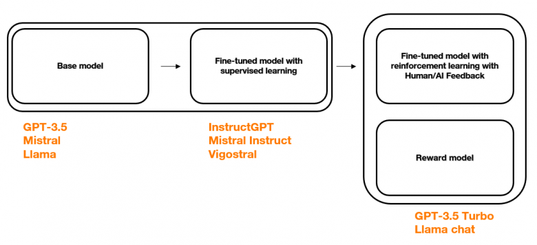 The development pipeline of is built mainly from two blocks: a basic model, developed to encode the language and its rules, and a second model, which is fine-tuned to respond to specific instructions (e.g. open questions/answers). This second model can then be further tailored to the desired task (e.g. customer relations chatbot) and/or aligned with stated values (e.g. adherence to a company’s ethical charter).