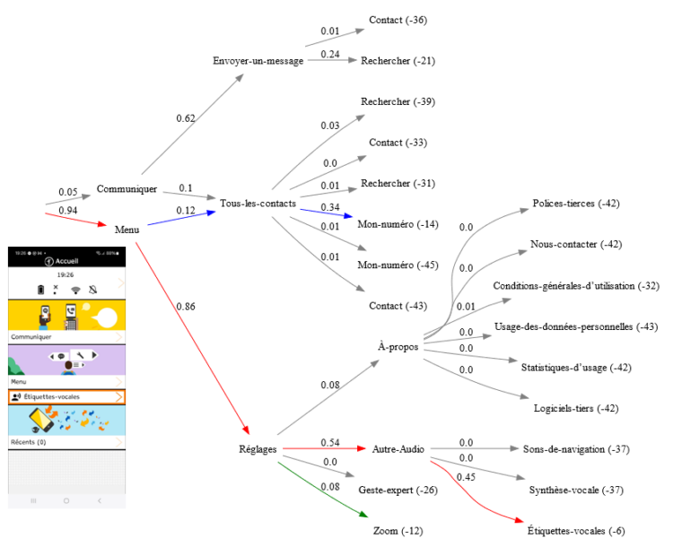 With this prototype, Orange’s research also sought to test the ability of ABIT-H to precisely model users’ interaction activity, using a “task model” that can be generated automatically by the algorithm. This interpretable model provides a graphical representation of the interaction (coded in Dot language) incorporating usage statistics, as illustrated in Figure 1. In this directed graph, each node corresponds to a menu that has been selected by the user. Each branch of the graph corresponds to a navigation task performed by the user, such as the sequence: Menu à Settings à Other Audio à Voice Labels. The model shows the interface’s logical structure of navigation, and the conditional probabilities of transitions between menus. The joint probability for each task is indicated at the end of the path (on the right) on the scale of evidence in decibans (dB). This probability reflects the usage level of each task at the current time. For example, it can be deduced from this model that access to the “Voice Labels” function (evidence of -6 dB) is the task most likely to be performed by the user at the moment in question.