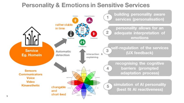 Now we know what personality profiles are and the reasons for choosing the Big Five to describe users and their needs, let us consider how they can be used smartly for the benefit of the user. The goal was privacy-friendly and user-friendly profiling. But how can this be done? The idea is to insert a model or algorithm that profiles the user inside the service itself, for example a smartphone app. How does it work? The user installs the service and during installation, the service computes the personality profile based on the available data accessed by the user. The given profile is only available to the user’s application, ensuring that the data is protected and not visible to anyone else. This profiling will be an inherent part of the service installation, and it has many advantages: for example, the ability to fine-tune the initial interface configuration and feature presentation. Other advantages include the possibility of tailored support in the adaptation process and the simulation of matching chatbot or virtual agent personalities. Given that the application already knows the profile, it will be able to adjust the content and communication. It will also be possible to reduce users’ cognitive, communicative and technological barriers through a tailored adaptation process. Uncertainty and fears can be actively tamed and adapting to advanced technologies can be supported. Communication can be better adapted to users thanks to profiling.