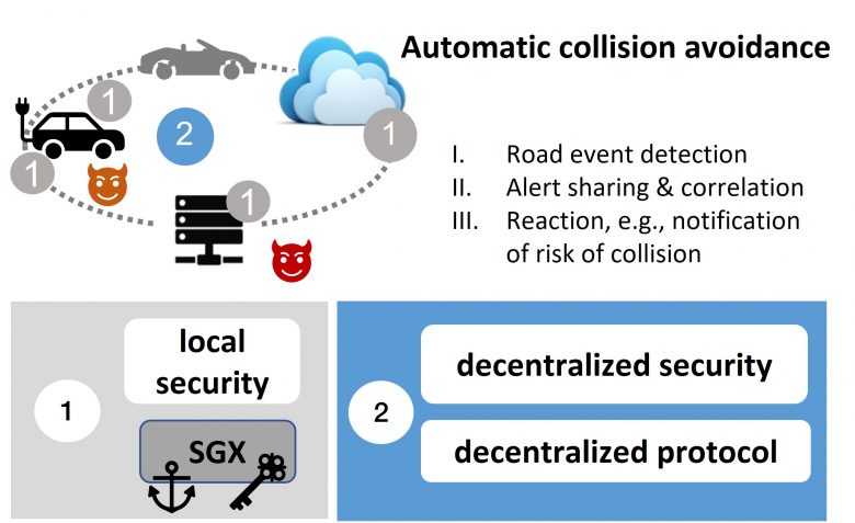 Figure 2 shows how a TEE is used to prevent collisions in autonomous vehicle networks, combining the high local level of data protection provided by the TEE with more flexible decentralized security using a distributed protocol.