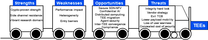 The opportunities and risks of TEEs are comprehensively analyzed using the SWOT (Strengths, Weaknesses, Opportunities and Threats) approach. This provides an overview of: (1) the strengths of a security technology for protecting critical assets, and (2) the main applications; but also its possible limitations in terms of (1) residual threats, and (2) barriers to uptake.