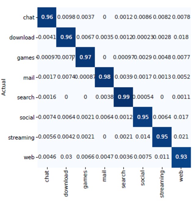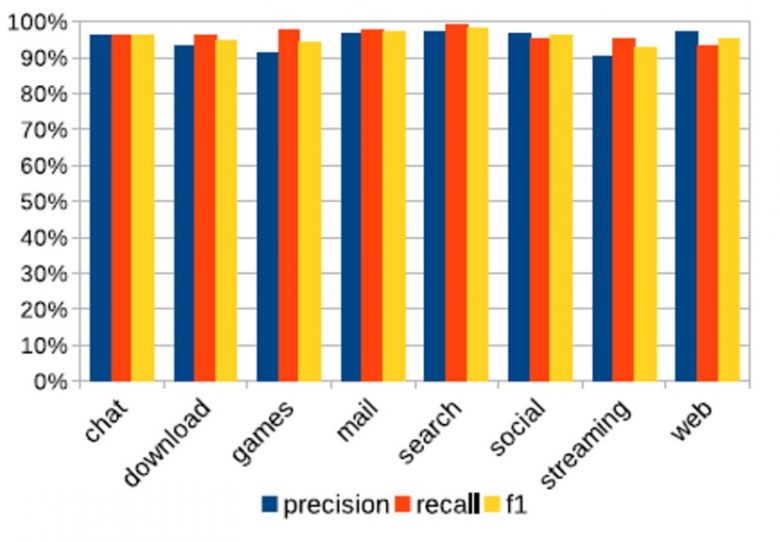 Orange, en collaboration avec l’université de Waterloo au Canada, a développé un modèle d’IA (Intelligence Artificielle), composé de réseaux de neurones convolutifs et de réseaux récurrents à mémoire court et long terme, permettant de classifier les catégories d’applications (navigation web, streaming vidéo, chat, etc.) avec une réussite de 96% et les applications (Facebook, Gmail, Netflix, etc.) avec un taux de succès de 97%. Les tests ont été effectués pour classifier en 8 catégories d’applications (cf. Figure 4) et en 19 applications.