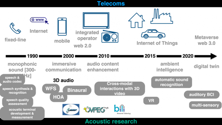 Le domaine des télécommunications (ou ICT pour Information and Communication Technologies) est axé depuis l’origine sur les communications vocales. L’acoustique y a longtemps représenté un enjeu clé des activités de recherche, avec notamment les travaux sur le codage de la parole, la synthèse vocale ou la reconnaissance de la parole. La diversification des technologies de communication aurait pu induire une baisse d’intérêt pour les questions autour de l’acoustique. Il n’en est rien, bien au contraire. Au fil des évolutions technologiques, on observe un constant renouvellement des thèmes de recherche avec à la clé un flux d’innovations (Figure 1) : l’immersion sonore, la reconnaissance automatique de sons (qui peut être utilisée par exemple pour la surveillance des environnements naturels ou urbains, et des maisons), les interfaces cerveau ordinateur pilotées par des sons, etc.