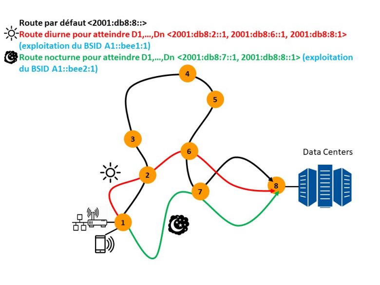 Dans un RCE IPv6, ces politiques d’ingénierie de trafic peuvent reposer sur la technique de routage à segments (Segment Routing). Les segments sont des portions du réseau qui sont utilisés pour acheminer le trafic selon différents critères tels que sa destination, son profil ou encore le comportement des clients souscripteurs du service auquel ce trafic correspond. Le concept d’identifiant de segment d’association (BSID, Binding Segment IDentifier), l’un des outils utilisés par la technique de routage à segments, peut être mis à profit pour identifier les politiques d’ingénierie de trafic à conscience énergétique. L’usage des BSID peut ainsi conduire à l’établissement de routes diurnes et nocturnes, comme l’illustre la Figure 2.