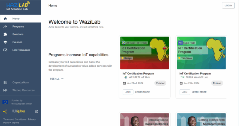 Afin de faciliter l’accès des hubs africains aux plateformes technologiques leur permettant de conceptualiser, développer et prototyper des services innovants, le projet HUBiquitous a conçu et déployé la plateforme Wazilab ainsi que la Solution Box. Ces deux outils, visent à renforcer les capacités locales et à encourager l’innovation. Le WaziLab[10] est une plateforme en ligne proposant des cours et des ressources pour former les utilisateurs aux technologies IoT. C’est une plateforme tout-en-un accessible gratuitement aux hubs afin de leur permettre d’offrir des programmes de formation en IoT et en IA à leur écosystème. La plateforme permet ainsi aux étudiants, éducateurs et professionnels d’accéder à des formations adaptées à leurs besoins.