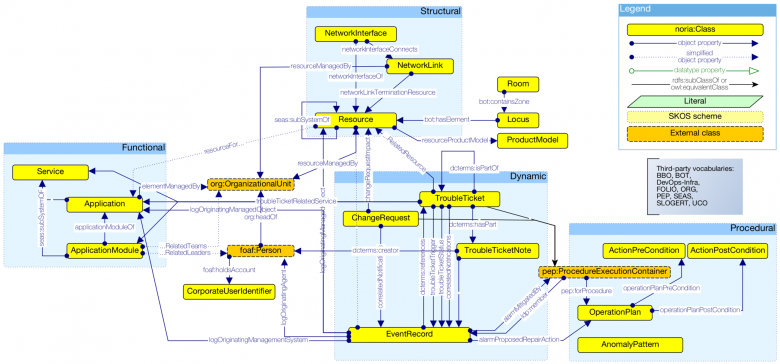 Pour cela, NORIA fournit une vue réconciliée des données provenant de multiples plates-formes, services et couches de réseau. Ce graphe de connaissances massif est structuré par l’ontologie NORIA-O (illustrée ci-dessous avec les concepts principaux de l’ontologie en jaune), qui modélise les aspects temporels et dynamiques (c.-à-d. la vie du réseau dont les évènements et les tickets d’incident), structurels (c.-à-d. la topologie de l’infrastructure avec ses ressources physiques et virtuelles ainsi que les liaisons réseaux), procéduraux (c.-à-d. les procédures pouvant s’exécuter sur le réseau telles que les opérations de remédiation) et fonctionnels des réseaux (c.-à-d. les services et applications portés par l’infrastructure) :