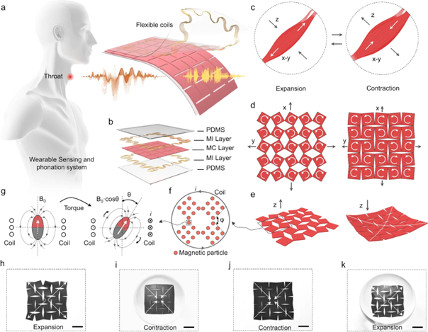 a – Illustration du système de détection acoustique attaché à la gorge b – Diagramme d’explosion montrant chaque couche de la conception du dispositif c – Deux modes de mouvement musculaire, l’expansion induit l’allongement dans les axes x et y, tandis que la contraction induit l’allongement dans l’axe z. d et e – Réponse du dispositif structuré en kirigami aux mouvements musculaires dans les directions x, y (d) et z (e) : l’expansion entraîne une dilatation des axes x et y et une moindre déformation de l’axe z, tandis que la contraction entraîne une moindre déformation dans les directions x et y et une dilatation de l’axe z. f – Illustration détaillée de la variation du champ magnétique causée par les particules magnétiques g – la particule magnétique elle-même subit un couple causé par la déformation appliquée au polymère (g), générant ainsi un changement de flux magnétique et, par la suite, un courant dans la bobine. h à k – Cela génère un changement de flux magnétique et, par la suite, un courant dans la bobine. La photo du dispositif à l’état d’expansion musculaire est représentée en h (axe x, axe y), i (axe z), et à l’état de contraction musculaire est représentée en j (axe x, axe y), k (axe z).