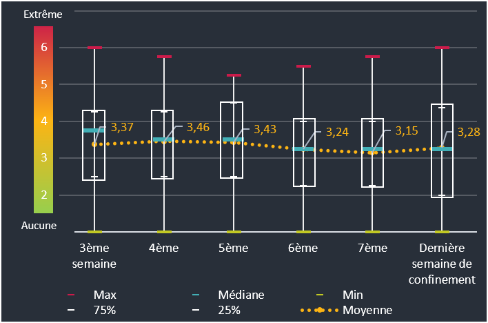 La moyenne et la médiane du niveau de la charge mentale restent “stables” tout au long du confinement. On observe que l’écart entre les salariés ayant une faible, versus une forte charge mentale, se creuse pendant la dernière semaine de confinement.