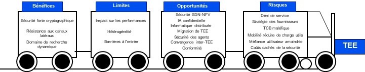 En termes de limites, les TEE nécessitent de trouver des compromis entre sécurité et performances : contraintes sur la taille de la TCB, surcoûts induits par les changements de contexte en bordure d’enclave et par le chiffrement des données. L’interopérabilité est aussi un verrou majeur, avec des barrières d’hétérogénéité multiples (applicatives, architectures matérielles, technologies de sécurité). La prise en main reste un défi, mais se simplifie avec l’intégration des TEE dans les plates-formes Cloud.