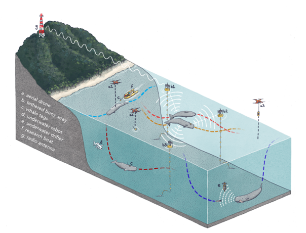 a. Drone aérien b. Réseau de bouées captives c. Balise sur les cachalots d. Robot sous-marin e. Dériveur sous-marin f. Bateau de recherche g. Antenne radio